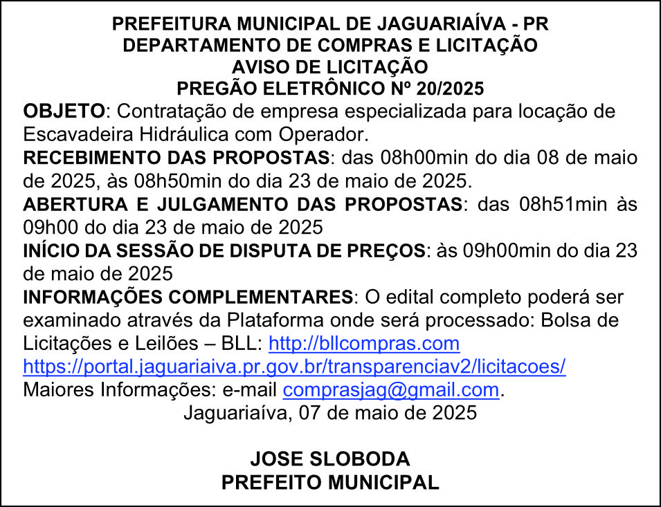Aviso de Licitação Pregão Eletrônico Nº 20/2025