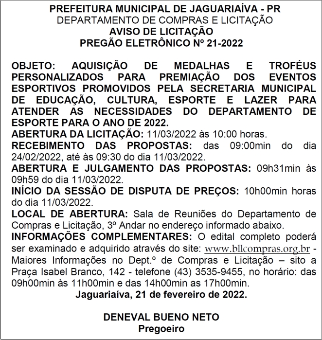 Aviso de Licitação Pregão Eletrônico Nº 21/2022
