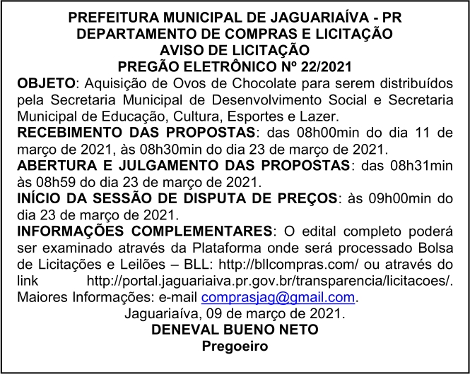 Aviso de Licitação Pregão Eletrônico Nº 22/2021