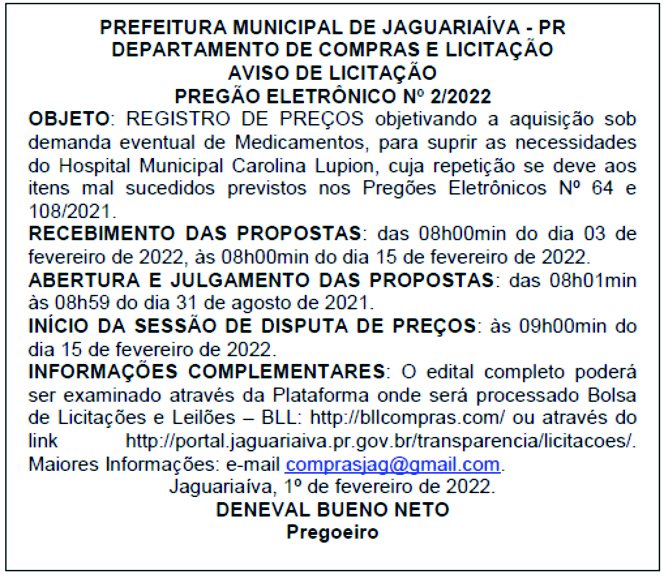 Aviso de Licitação Pregão Eletrônico Nº 2/2022