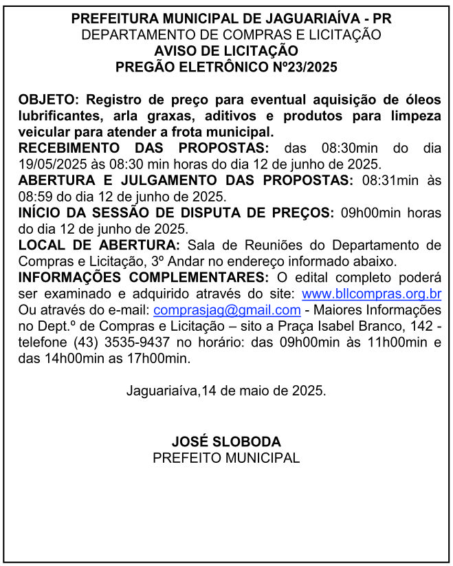 Aviso de Licitação Pregão Eletrônico Nº 23/2025