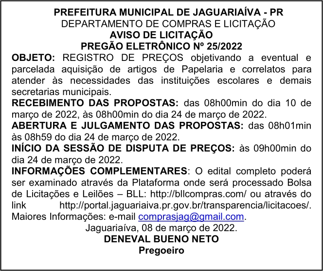 Aviso de Licitação Pregão Eletrônico Nº 25/2022
