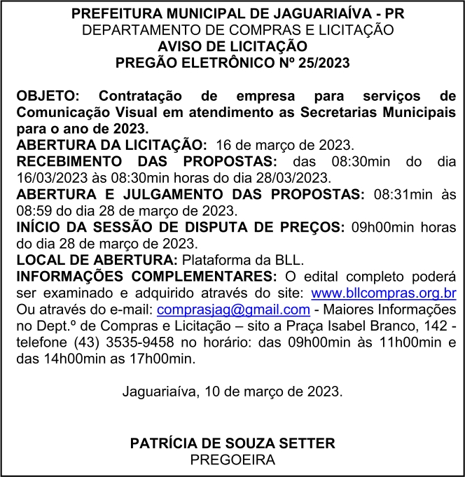 Aviso de Licitação Pregão Eletrônico Nº 25/2023