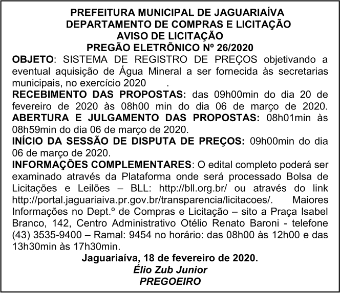 Aviso de Licitação Pregão Eletrônico Nº 26/2020
