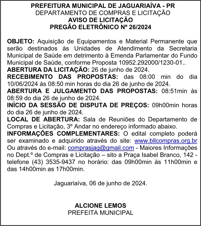 Aviso de Licitação Pregão Eletrônico Nº 26/2024