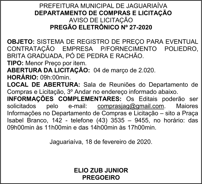 Aviso de Licitação Pregão Eletrônico Nº 27/2020