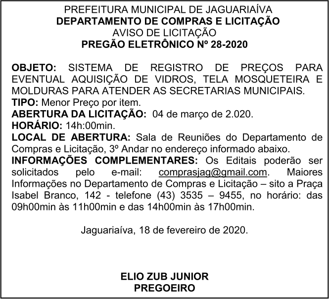 Aviso de Licitação Pregão Eletrônico Nº 28/2020