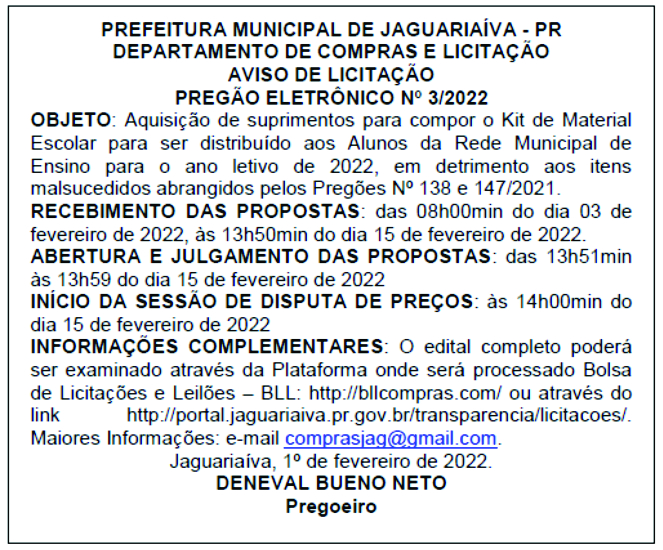 Aviso de Licitação Pregão Eletrônico Nº 3/2022
