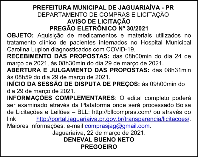 Aviso de Licitação Pregão Eletrônico Nº 30/2021