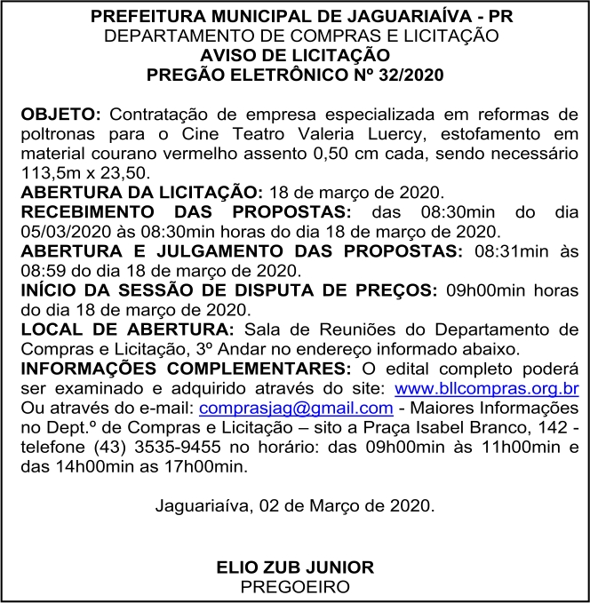 Aviso de Licitação Pregão Eletrônico Nº 32/2020