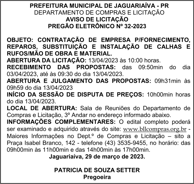 Aviso de Licitação Pregão Eletrônico Nº 32/2023
