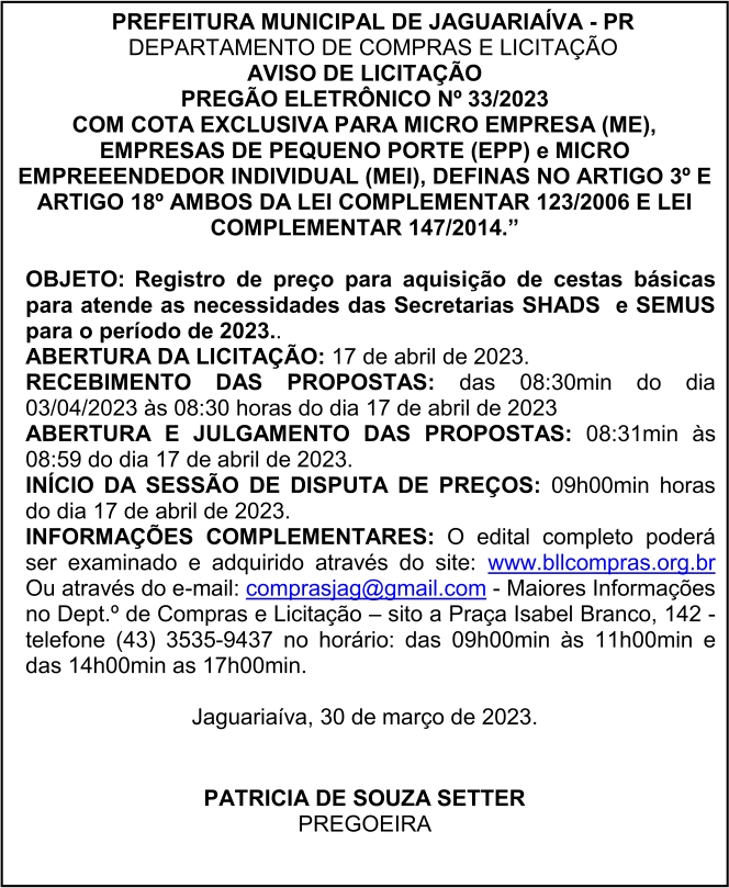 Aviso de Licitação Pregão Eletrônico Nº 33/2023