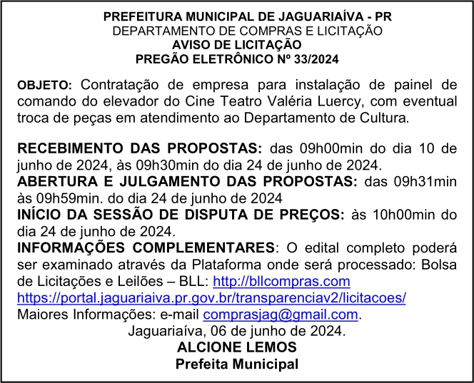 Aviso de Licitação Pregão Eletrônico Nº 33/2024