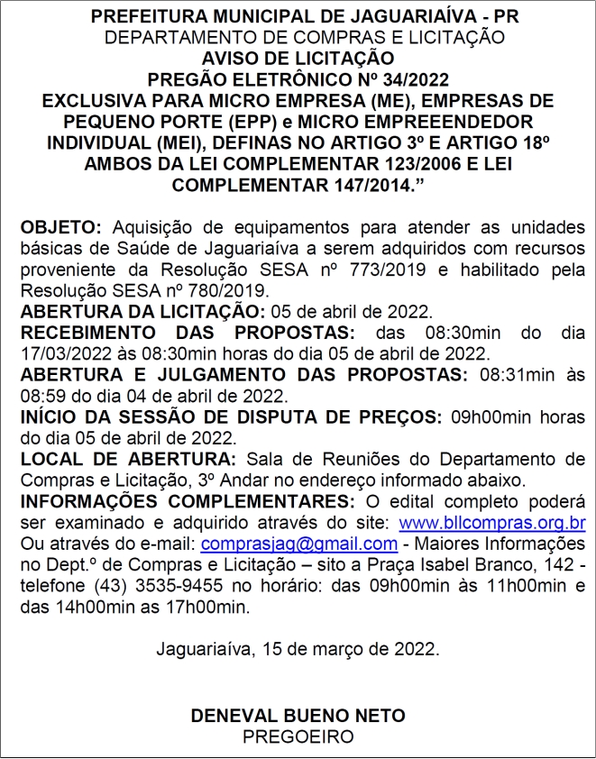 Aviso de Licitação Pregão Eletrônico Nº 34/2022