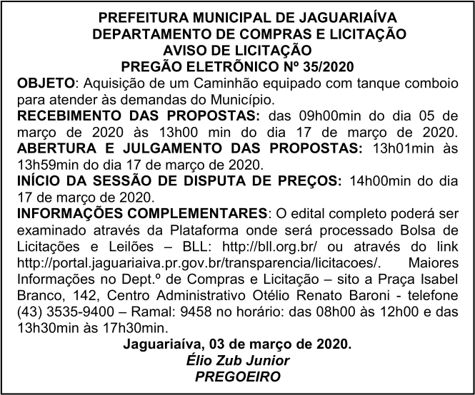 Aviso de Licitação Pregão Eletrônico Nº 35/2020
