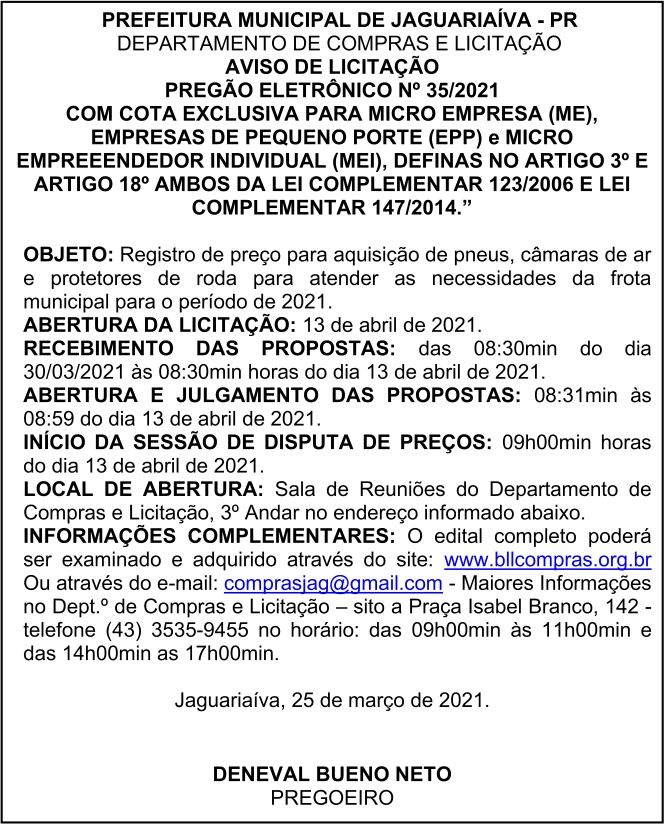 Aviso de Licitação Pregão Eletrônico Nº 35/2021