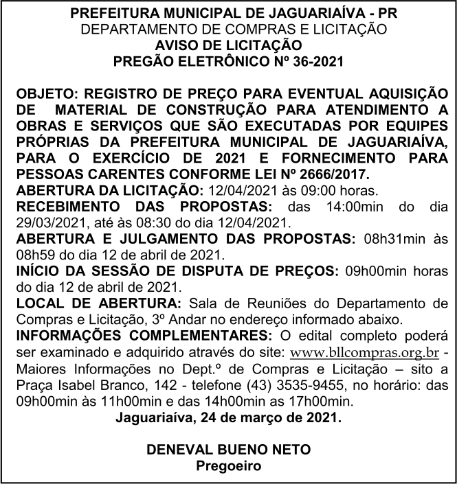 Aviso de Licitação Pregão Eletrônico Nº 36/2021