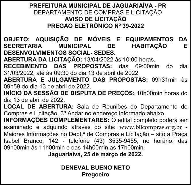 Aviso de Licitação Pregão Eletrônico Nº 39/2022