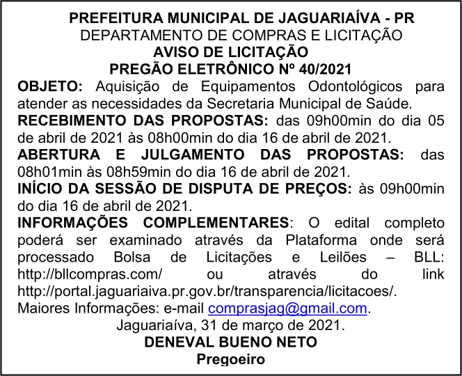 Aviso de Licitação Pregão Eletrônico Nº 40/2021