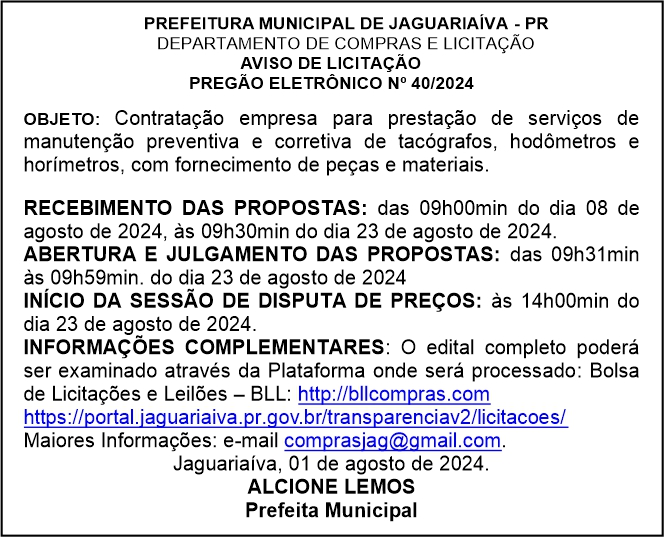 Aviso de Licitação Pregão Eletrônico Nº 40/2024