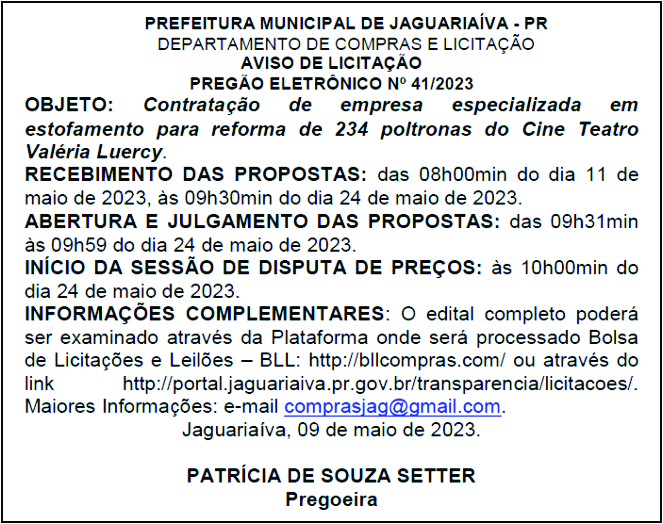 Aviso de Licitação Pregão Eletrônico Nº 41/2023