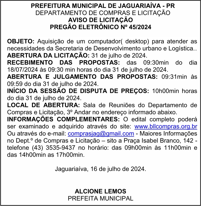 Aviso de Licitação Pregão Eletrônico Nº 45/2024