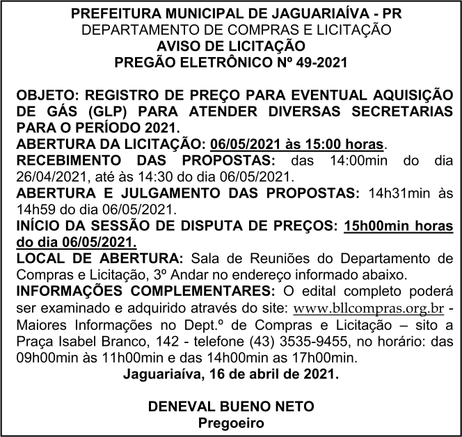 Aviso de Licitação Pregão Eletrônico Nº 49/2021