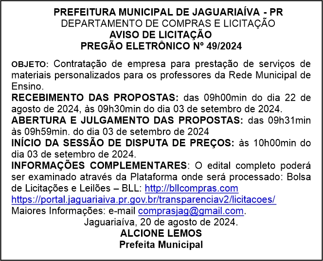 Aviso de Licitação Pregão Eletrônico Nº 49/2024