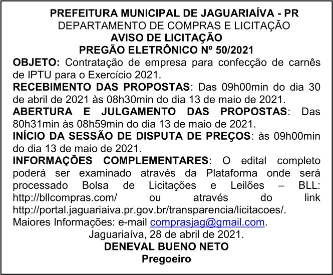 Aviso de Licitação Pregão Eletrônico Nº 50/2021