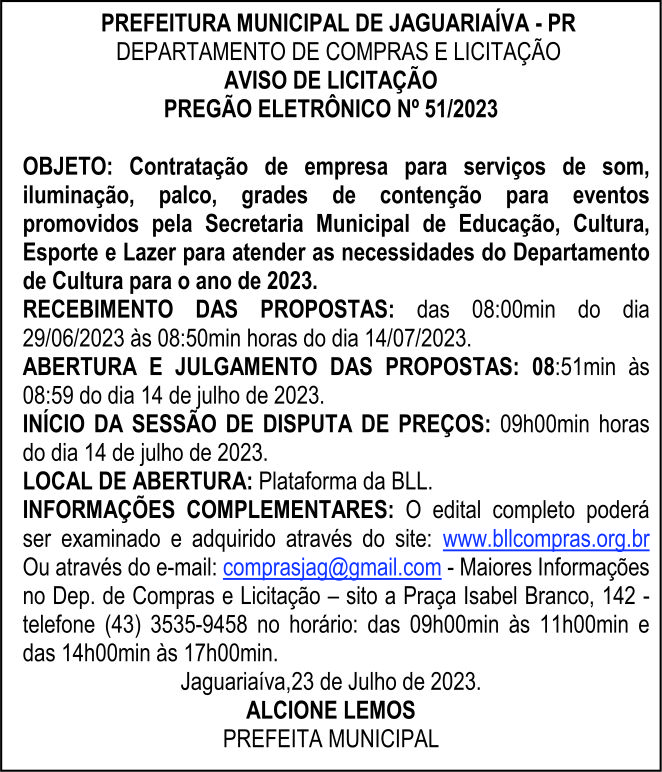 Aviso de Licitação Pregão Eletrônico Nº 51/2023