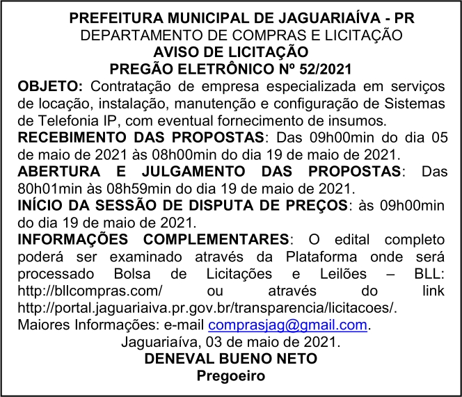 Aviso de Licitação Pregão Eletrônico Nº 52/2021
