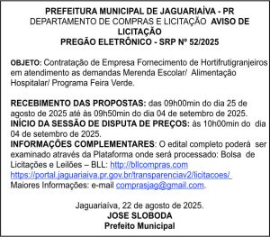 Aviso de Licitação Pregão Eletrônico Nº 52/2025