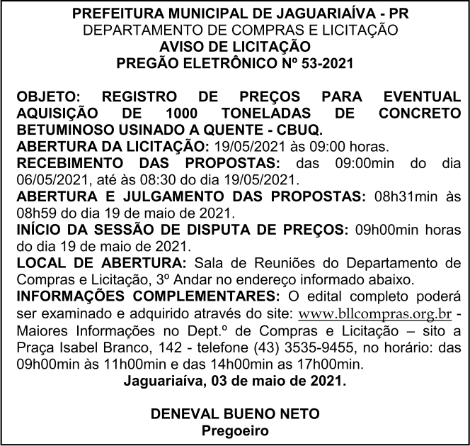 Aviso de Licitação Pregão Eletrônico Nº 53/2021