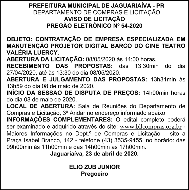 Aviso de Licitação Pregão Eletrônico Nº 54/2020