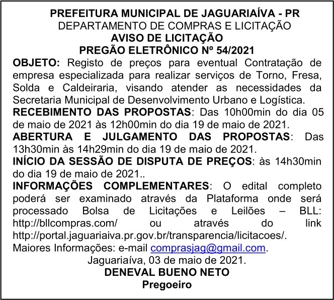 Aviso de Licitação Pregão Eletrônico Nº 54/2021