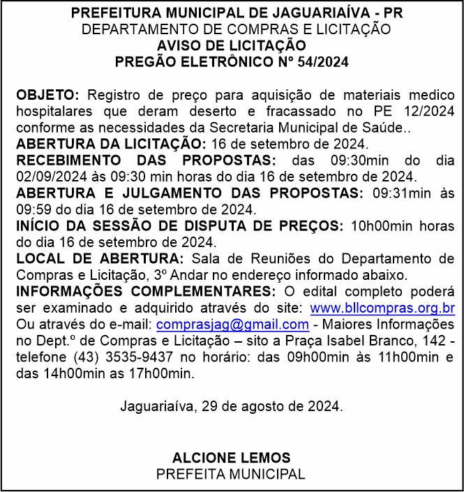 Aviso de Licitação Pregão Eletrônico Nº 54/2024