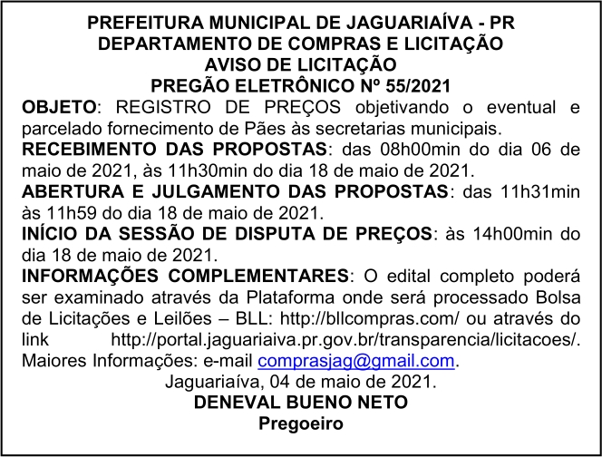 Aviso de Licitação Pregão Eletrônico Nº 55/2021