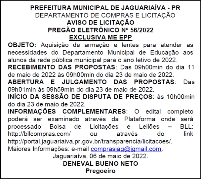 Aviso de Licitação Pregão Eletrônico Nº 56/2022