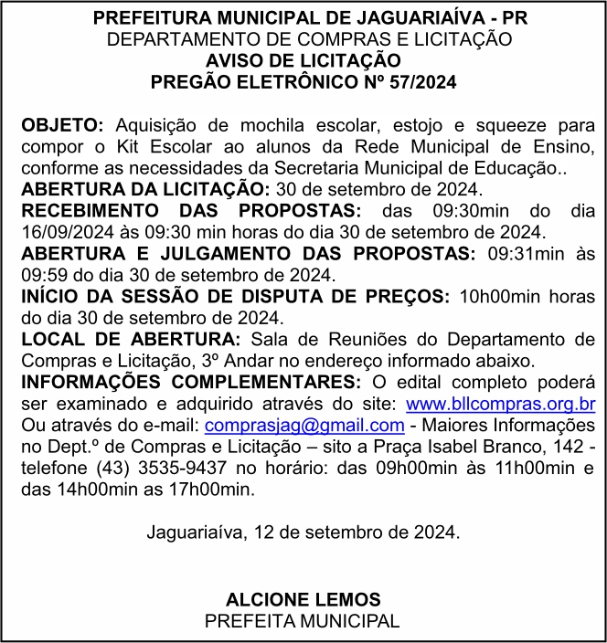 Aviso de Licitação Pregão Eletrônico Nº 57/2024