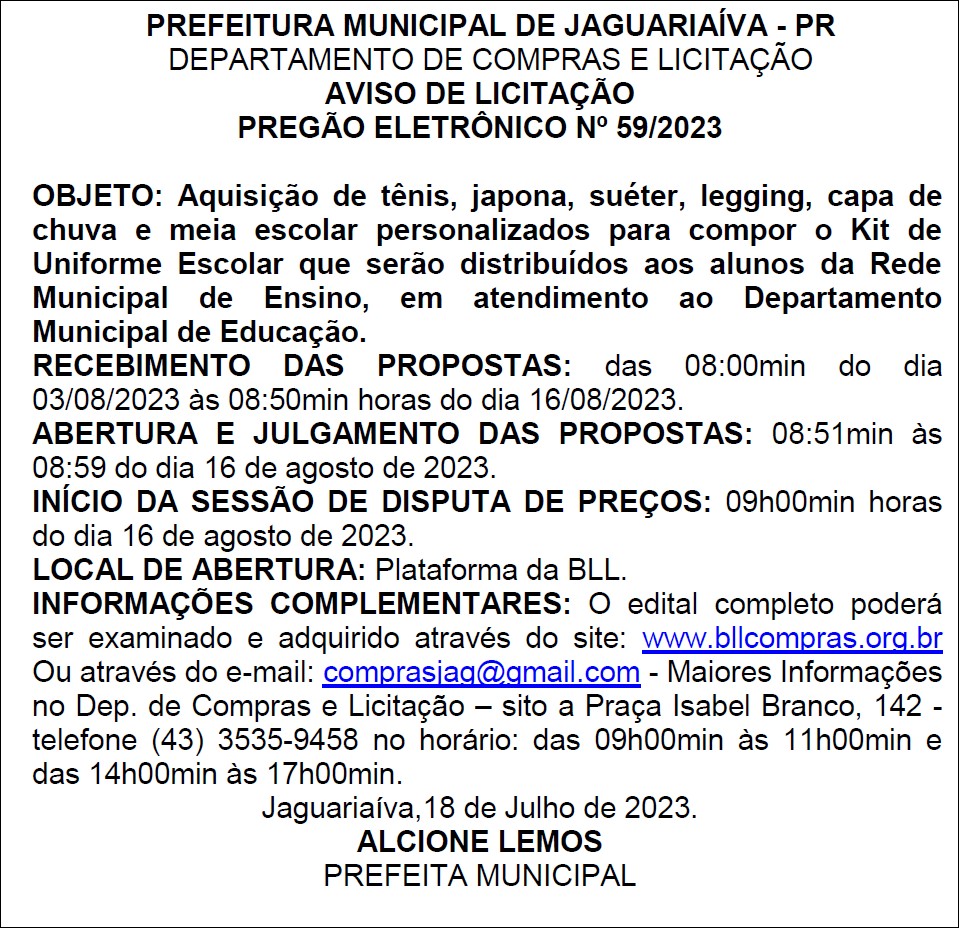 Aviso de Licitação Pregão Eletrônico Nº 59/2023