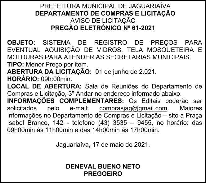 Aviso de Licitação Pregão Eletrônico Nº 61/2021