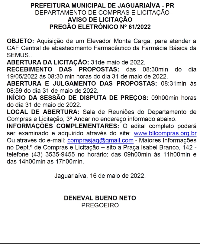 Aviso de Licitação Pregão Eletrônico Nº 61/2022