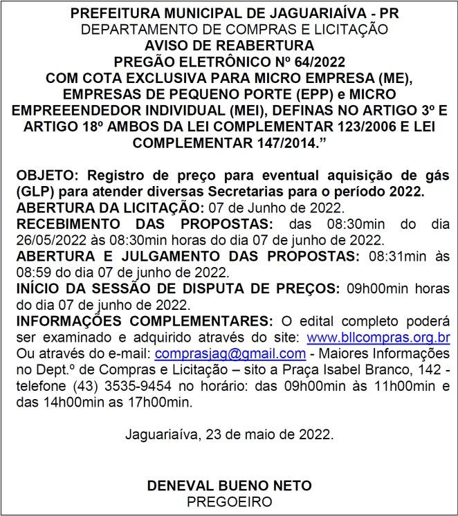 Aviso de Licitação Pregão Eletrônico Nº 64/2022