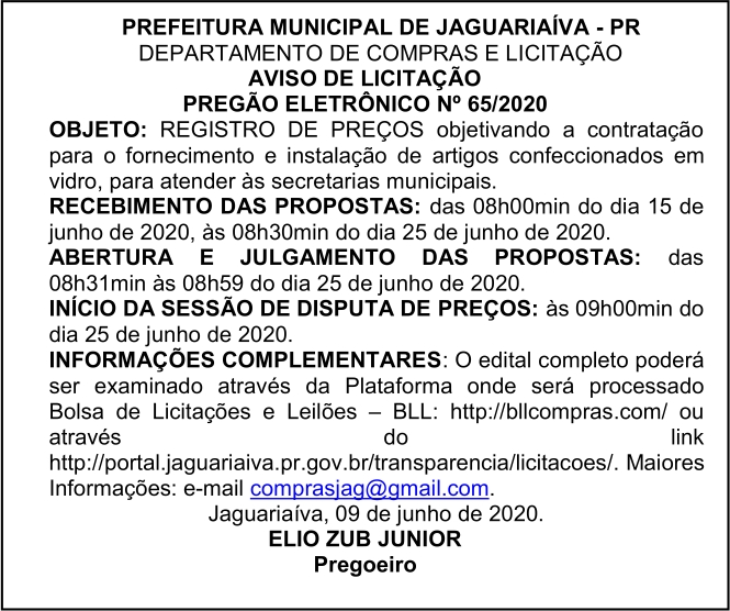 Aviso de Licitação Pregão Eletrônico Nº 65/2020