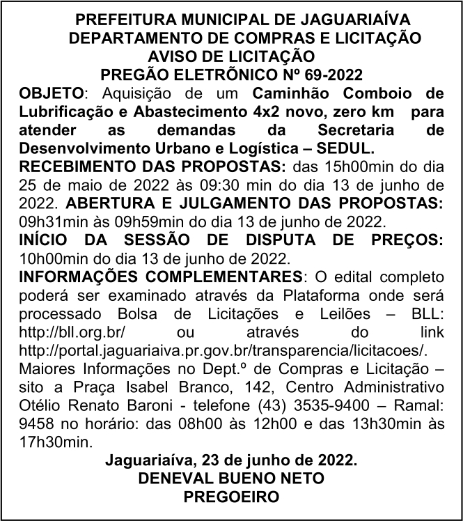 Aviso de Licitação Pregão Eletrônico Nº 69/2022