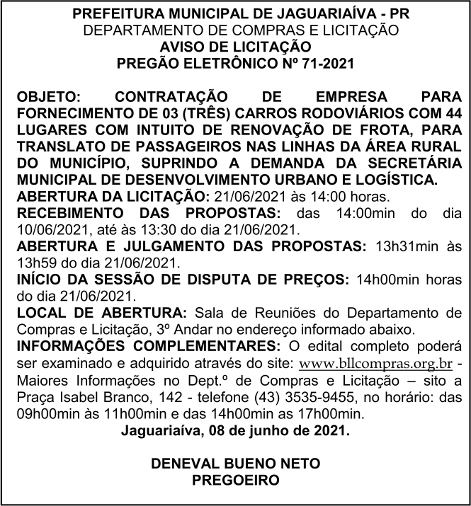 Aviso de Licitação Pregão Eletrônico Nº 71/2021