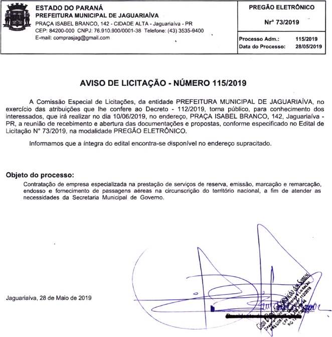Aviso de Licitação Pregão Eletrônico Nº 73/2019
