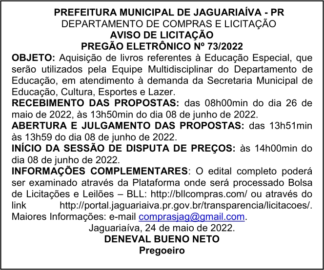Aviso de Licitação Pregão Eletrônico Nº 73/2022
