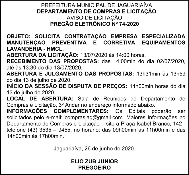 Aviso de Licitação Pregão Eletrônico Nº 74/2020