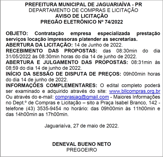 Aviso de Licitação Pregão Eletrônico Nº 74/2022